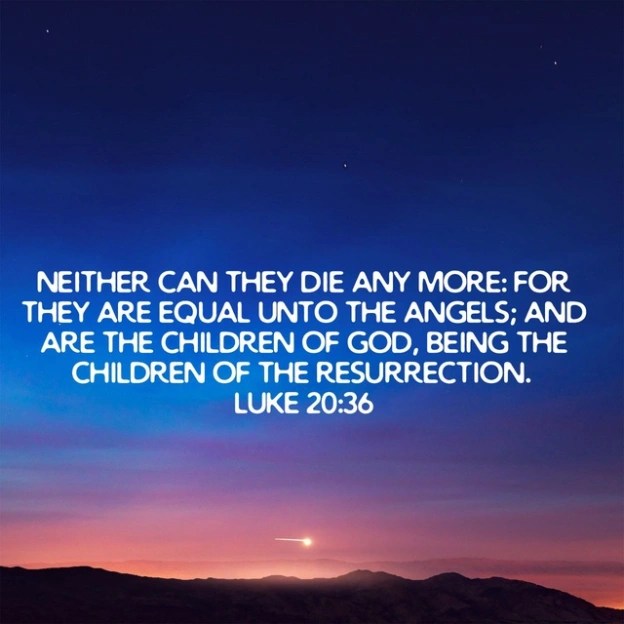 Luke 20: 34 Jesus replied, “The people of this age marry and are given in marriage. 35But those who are considered worthy of taking part in the age to come and in the resurrection from the dead will neither marry nor be given in marriage, 36and they can no longer die; for they are like the angels. They are God’s children, since they are children of the resurrection.