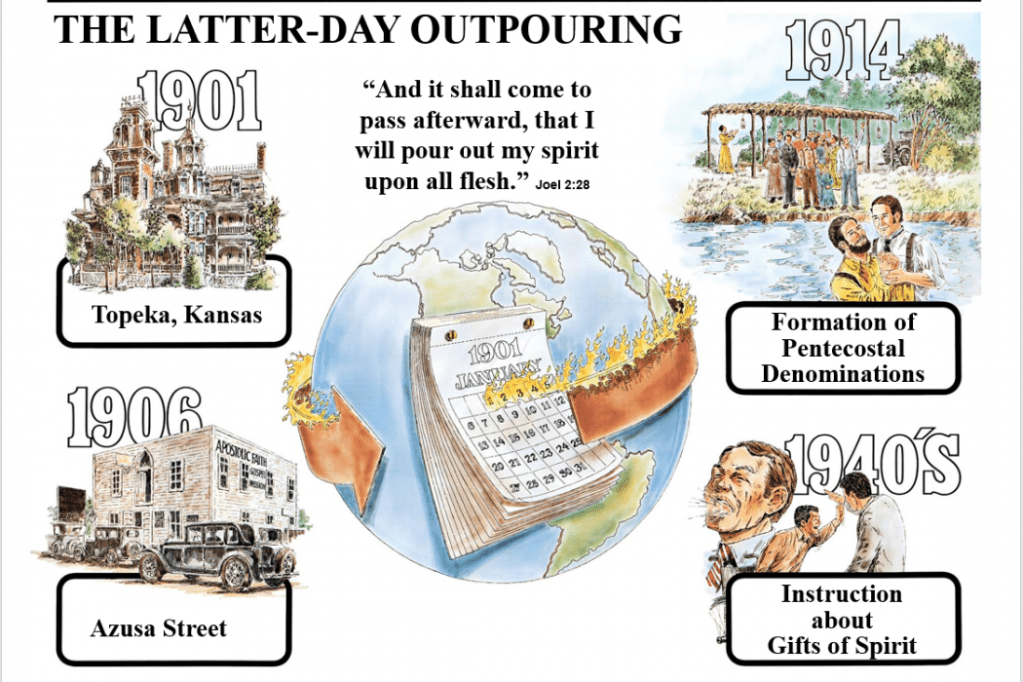 The term Latter Rain stems from Bible passages such as Jeremiah 3:3, 5:23–25, Joel 2:23, Hosea 6:3, Zechariah 10:1, and James 5:7. The idea of a latter rain was not new to Pentecostals. It was present from the earliest days of Pentecostalism, which believed that the reappearance of speaking in tongues and the baptism of the Holy Spirit marked the “latter rain of God’s Spirit.” It was believed that these were signs of the coming end of history. The outpouring of the Holy Spirit on Pentecost had been the “former rain” that established the Church, but the current “move” of the Spirit was the latter rain that would bring the Church’s work to completion and culminate in the imminent Second Coming of Jesus Christ.